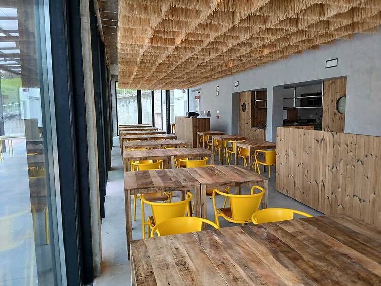 Em frente ao lago do Parque Central, com uma vista naturalmente privilegiada, e num equipamento público até então sem uso, este É Um Restaurante Parque conta ainda com uma peça da artista plástica Fernanda Fragateiro, a obra “É uma escultura” (2026). A instalação suspensa no tecto, composta por centenas de painéis de ráfia organizados em quadrícula, foi criada com o contributo de beneficiários da Crescer, apoiados pelo Espaço Ímpar. Mas o destaque é de facto a carta assinada pelo chef Nuno Dias, que assenta numa cozinha portuguesa contemporânea, com influências internacionais, fruto dos últimos anos a viver na Austrália, onde foi responsável pela abertura de sete restaurantes. “Não é tradicional”, assegura, antes de nos apresentar uma selecção de pratos que inclui desde uma salada de bacalhau com molho de pimentos, emulsão de cebola assada e poejos (8€), até bife de atum grelhado com compota de caldeirada e batata-doce (17€).