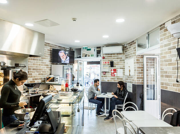 Um restaurante onde quem cozinha são refugiados sírios, uma verdadeira casa do Médio Oriente onde a mesa se enche de pratos feitos para partilhar. Nesta pequena sala com vista para o interior do Mercado de Arroios, vá directo aos kibbeh, uma espécie de croquetes de borrego com bulgur e nozes, e não se esqueça que rasgar um pedaço de pão para agarrar um tanto de baba ganoush ou de hummus.